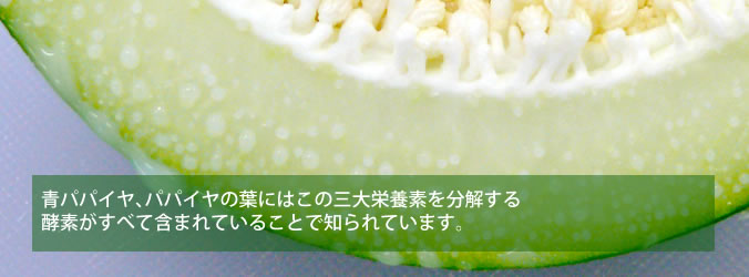 「食物酵素」のなかでも酵素の王様と言われるのがパパイヤです。パパイヤに含まれている酵素には、タンパク質、脂質糖分を同時に分解するパパイン酵素以外にもキモパパイン、カルパインなどの酵素も豊富に含まれています。