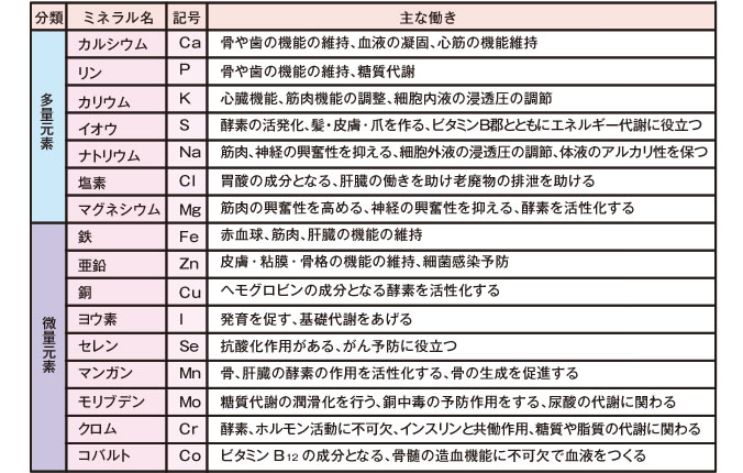 ミネラルは骨や歯をつくり、血液やホルモンとして体の成分になったり、イオンとなって体液のphや浸透圧を調整します。また、代謝に必要な酵素の働きを補います。酵素はたんぱく質で出来ており生体内で化学反応を促進し円滑に行う触媒の役目をしています。その酵素が活性化して本来の役目を果たすためには、ビタミン(補酵素)と同様に、ミネラル(補因子)が不可欠です。