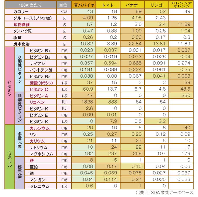 今まで健康に良いとされていたトマト、バナナ、リンゴ、バレンシアオレンジなどと較べてみると、食物繊維、葉酸、ビタミンC、カロテノイド(体内で吸収されるとビタミンAになる)、カルシウム、カリウム、鉄分、の6つの重要栄養素がまんべんなく摂取できることがわかります。