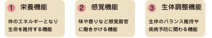 これまで、主に考えられてきた食品の機能とは、エネルギーやビタミン、ミネラル源として働き“栄養機能”と、食べたときに感じる味や香り“感覚機能”の2つでした。それに加え、第3の機能として“生体調整機能”が認められるようになりました。