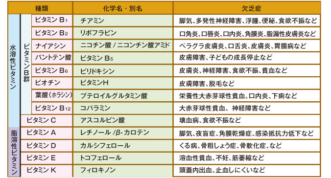 ビタミンは、炭水化物・たんぱく質・脂質の3大栄養素のようにエネルギー源や体の構成成分にはなりませんが、血管、粘膜、皮膚、骨などの健康を保ち、新陳代謝を促す働きにも関与しています。そのためビタミンが不足すると、それぞれのビタミンに特有の欠乏症状を引き起こします。いずれのビタミンの必要量はごくわずが、体の中で生成、合成することができないため、食物から摂取しなければなりません。