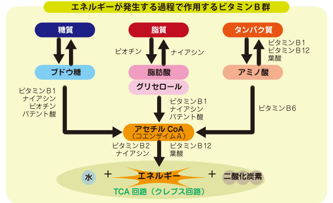 TCA回路に取り込まれるためには、アセチルCoAに変換されなければなりません。このとき酵素だけではエネルギー源をアセチルCoAに変換することができません。その働きを補う「補酵素」としてビタミンB群が必要です。