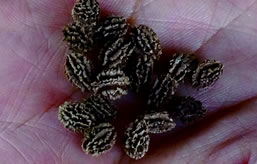 まっすぐに伸びた茎の先に長い葉柄を持つ大きな葉が特徴的ですが、その種の長さは約4mmほどと小粒です。灰色の種は未熟なので、なるべく黒い種を選んで蒔きます。